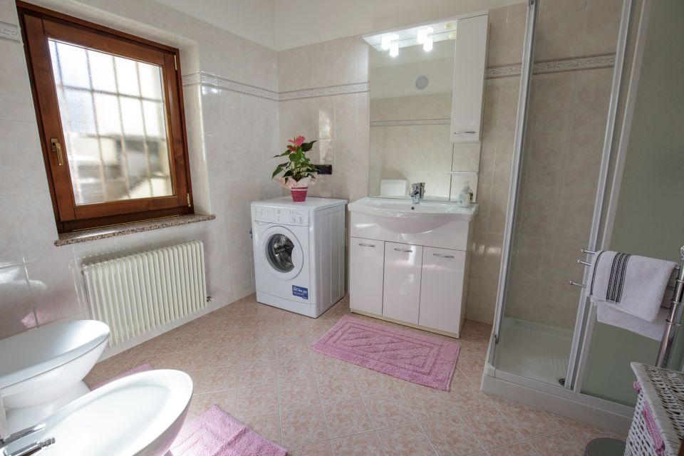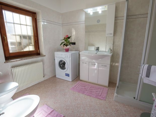 Il bagno provvisto di doccia, bidet , lavatrice è ampio e luminoso.