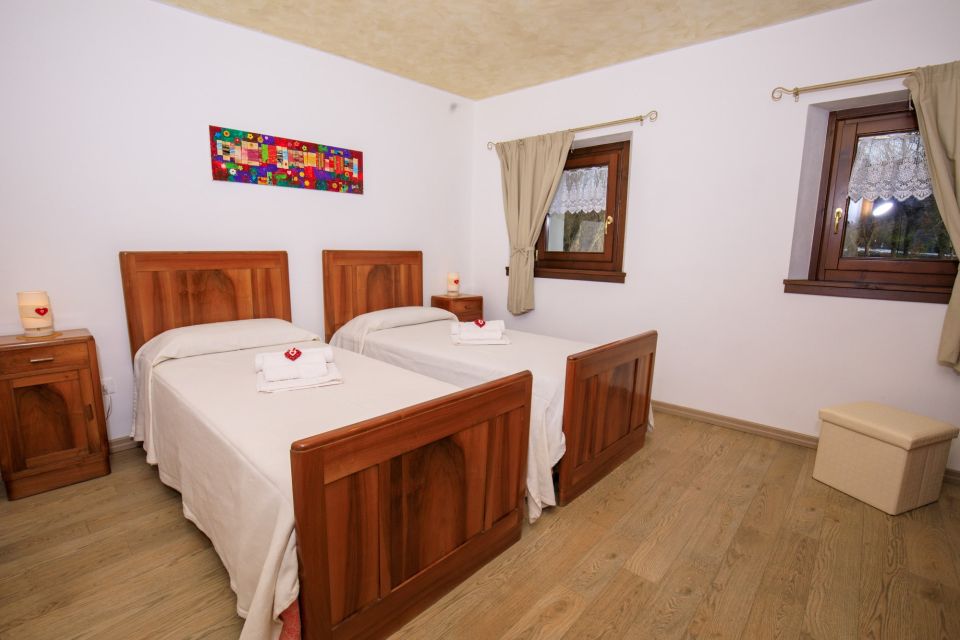 camera con due letti singoli e balcone con vista sul paesaggio naturale.